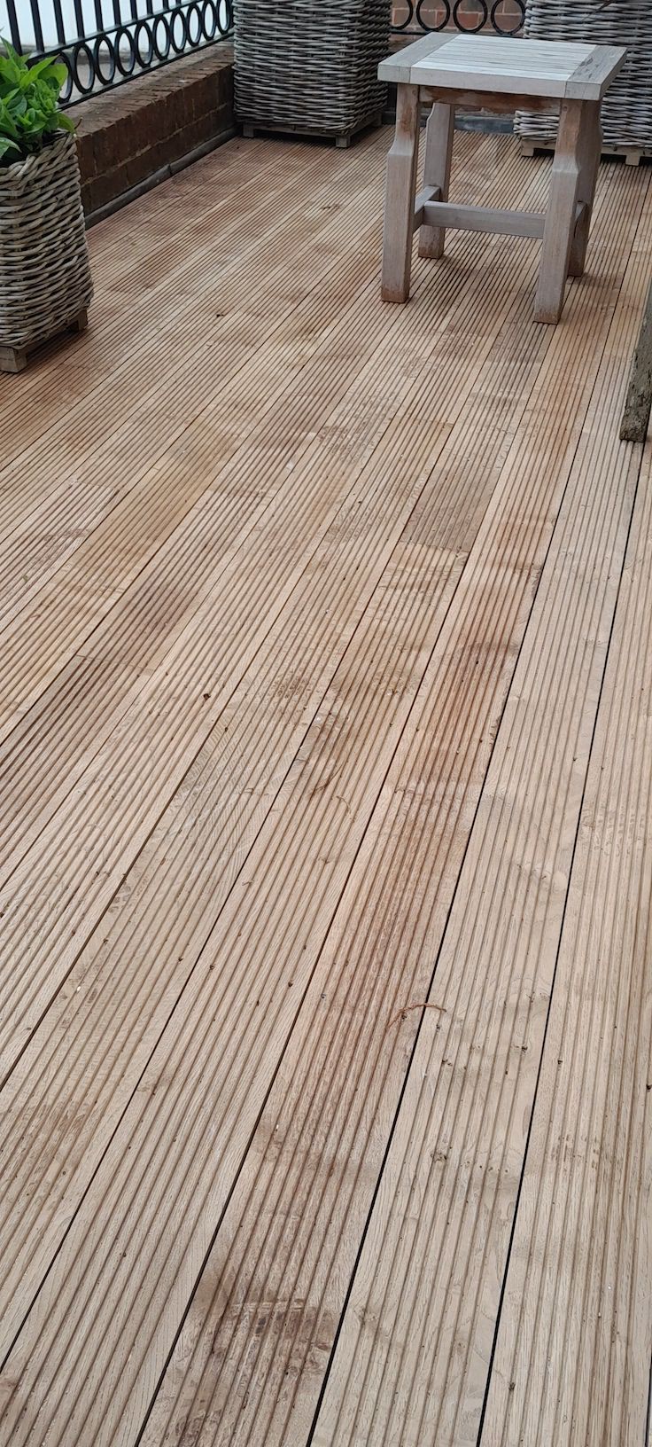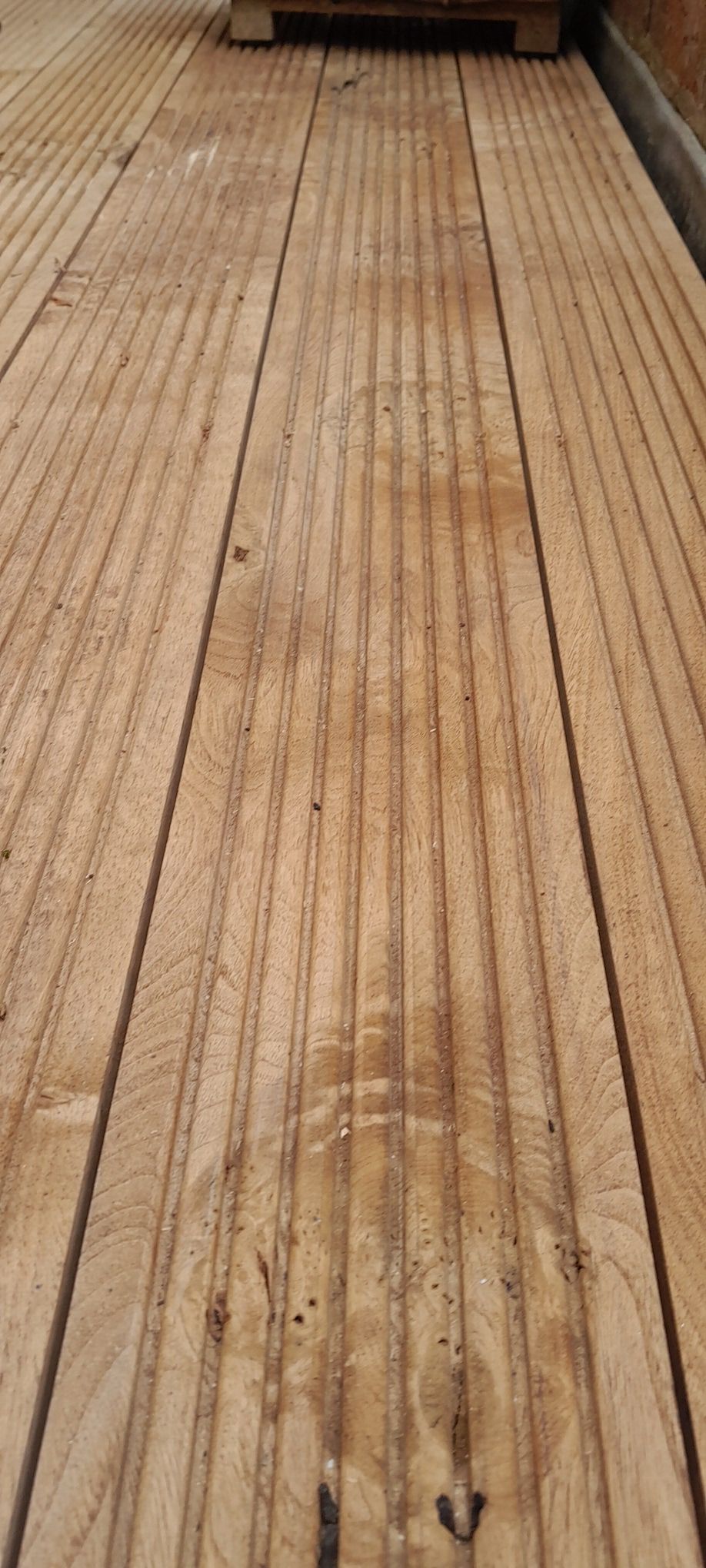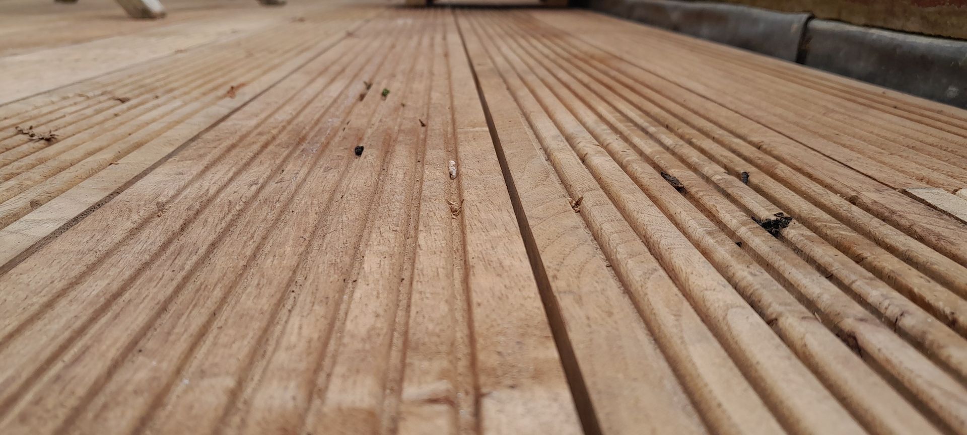 The board edges and ends were planed and sanded too give a look of age, the boards were also stained including the tongues before laying, this meant if the boards shrink there won't be any sign of new wood showing.